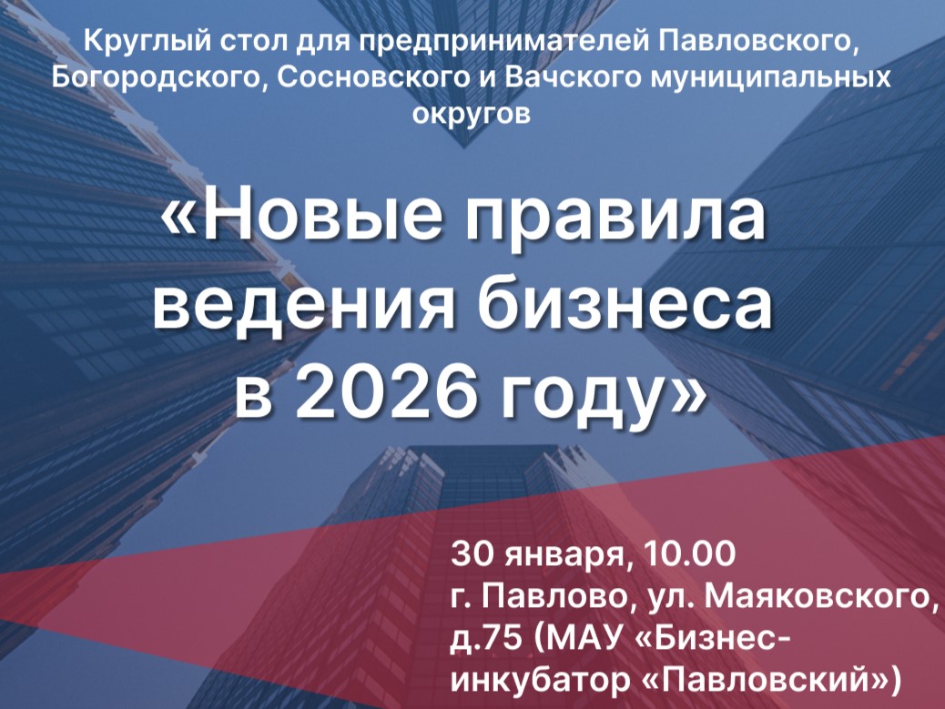 30 января в 10.00 в бизнес-инкубаторе «Павловский» (г. Павлово, ул. Маяковского, д. 75) состоится круглый стол «Новые правила ведения бизнеса в 2026 году» для предпринимателей западных муниципальных округов: Павловского, Богородского, Сосновского и Вачского.